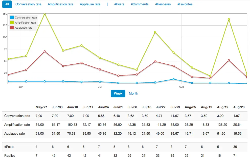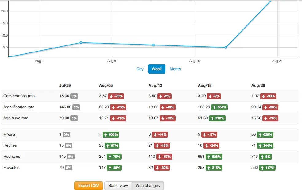 Analyze how the activity of users on your social media pages changes over time and instantly compare the % of decrease or increase for each metric by days/weeks/months.