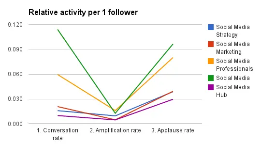 Although, Social Media Marketing community (the red one) is the second from the top based on the number of followers, it’s second from the bottom based on their activity. In this case, it’s better to use relative metrics per 1 follower to see which community is doing a better job at engaging their followers.