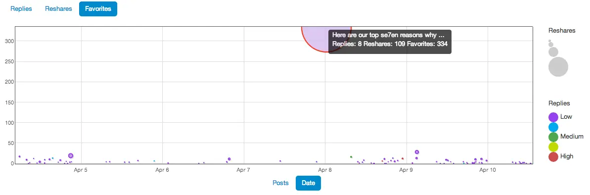 Notice the interesting pattern of posting activity. This winning post was the only one posted on Sunday (April 7), and as such was fully rewarded with higher response.