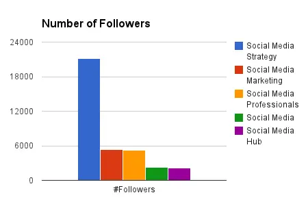 Let’s take, for example, 5 communities for social media professionals. I’ve arranged them by the number of followers (in descending order from left to right), and color coded them for convenience. The period of study was April 1-10, 2013. The tools used were TrueSocialMetrics and Google Drive (for graphs).