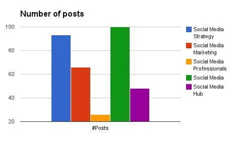 Social Media Marketing (red) had 2.5 times more posts than Social Media Professionals (yellow), with equal amount of followers. So Social Media Marketing’s followers need 2.5 times more time and effort to respond to all posts, which is why the activity is lower in this community. What this means is that you need to work a bit harder in the Social Media Marketing community than in the Social Media Professionals community to get your posts noticed. On the other hand, in the Social Media Marketing community you will have more content to read from others.