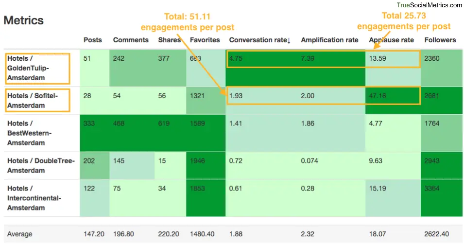 GoldenTulip may look like a winner at first glance, but when we dive into the numbers it becomes clear that Sofitel is an absolute winner with total 51.11 engagements per post with GoldenTulip taking 2nd place with 25.73 engagements per post: