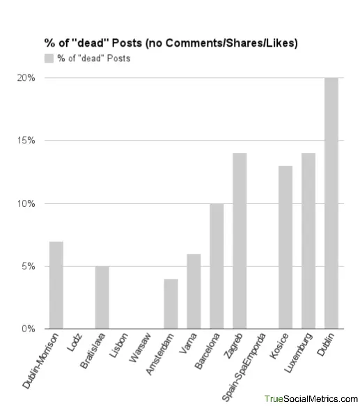 To discover the reasons for the epic success of DoubleTree Dublin-Morrison Hotel, the first thing to look at is content health: what percentage of posts are “dead” on their Facebook page (don’t get any reaction from followers: no likes, no shares, no comments). Let’s hunt some zombies: