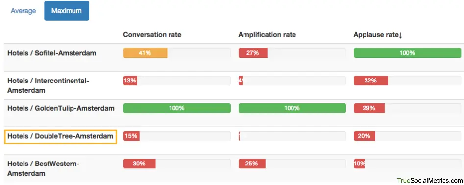 We’ve compared the hotels in three dimensions: Conversation rate, Amplification rate and Applause rate (Comments per post, Shares per post and Likes per post). With the maximum results marked as 100%, the following graphs will show us by how much each hotel is lagging behind the leader.