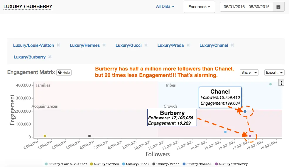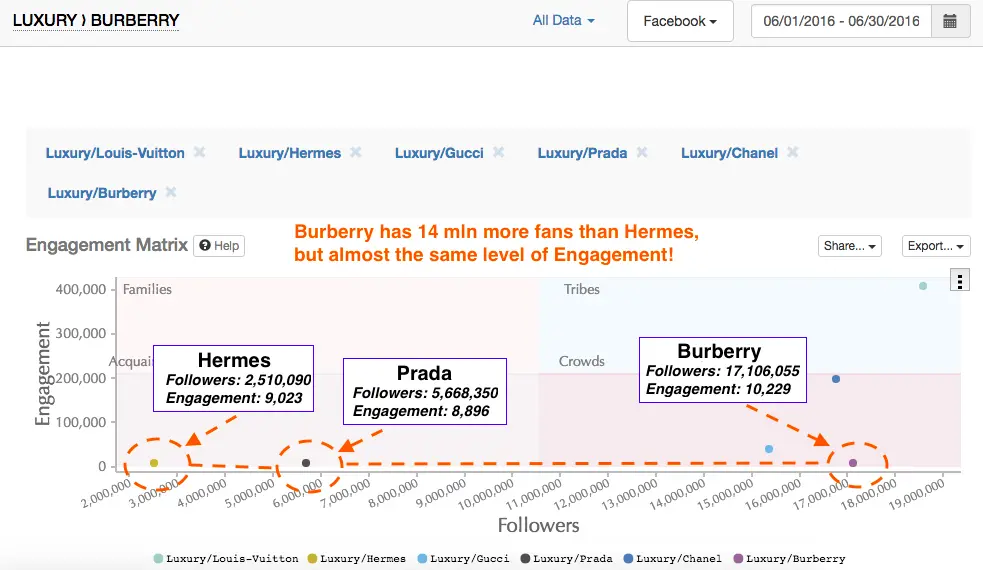 They have an indecently big audience and a miniscule engagement. I used Engagement matrix from TrueSocialMetrics to compare the top 5 luxury brands and evaluate how big and active their fan bases are. So here’s how you use this matrix: