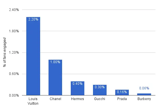 In an ideal world, if you have more followers you have more engagement. Well, not in this case. Hermes, Prada and Burberry - they all have an enormous difference in fan base size, but the same level of Engagement. What’s the point of Burberry having 17 million fans if they have the same level of engagement as Hermes with just 2.5 million fans? What’s the strategy behind having a huge tribe of people who ignore you?