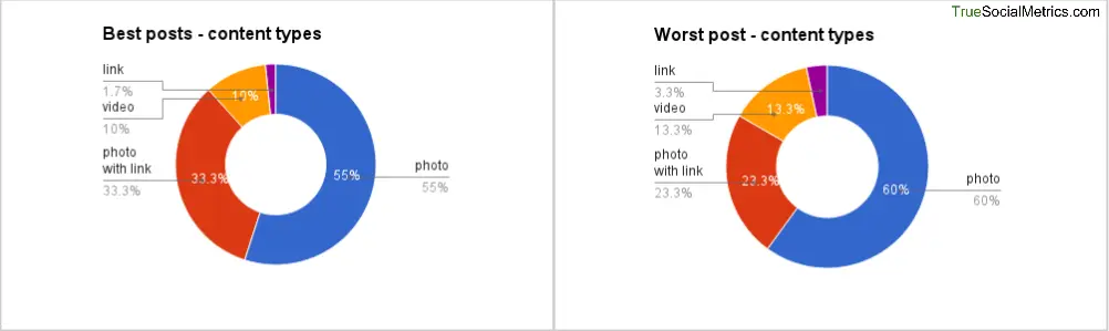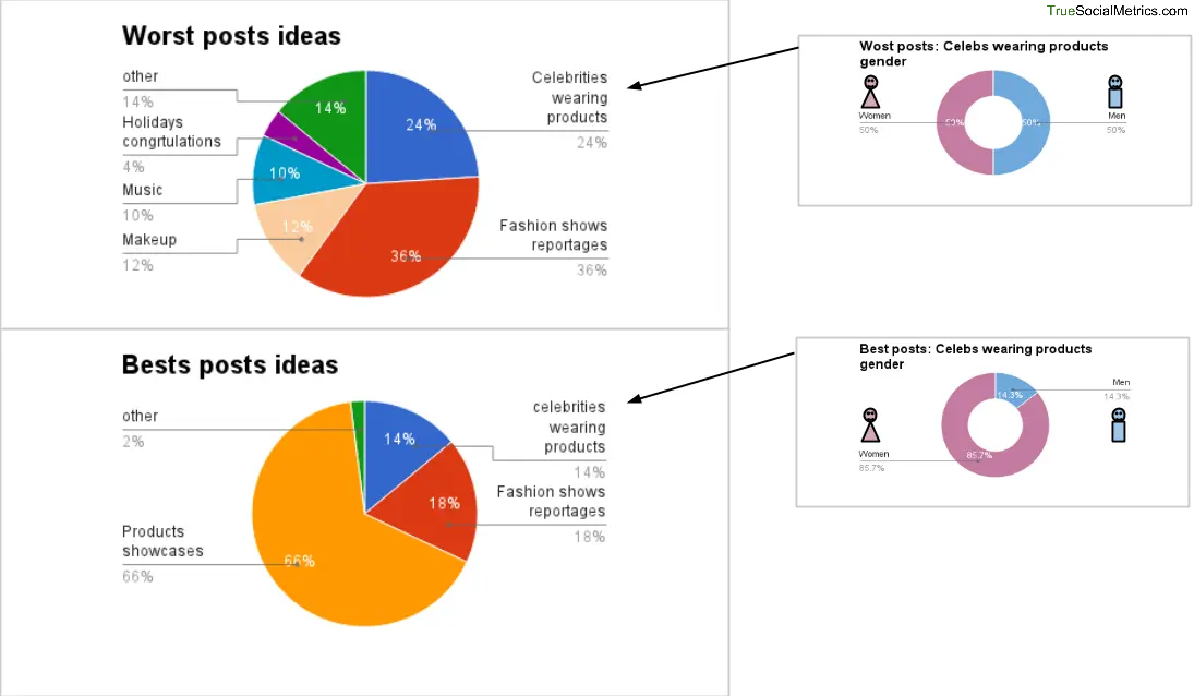 Notice that it’s hard to find product photos and videos among the worst posts. While reports from fashion shows and photos of male celebrities are riskier topics with a higher probability of falling into the low performing posts basket.