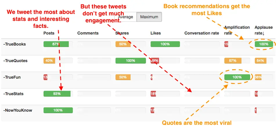 Books recommendations (#TrueBooks) get the most likes per tweet, and humor (#TrueFun) is the most shareable topic. While interesting facts (#NowYouKnow) and stats (#TrueStats) doesn't work really well. So why should you keep posting about topics your followers hate if you can use Segmentation to separate the weeds from the wheat?