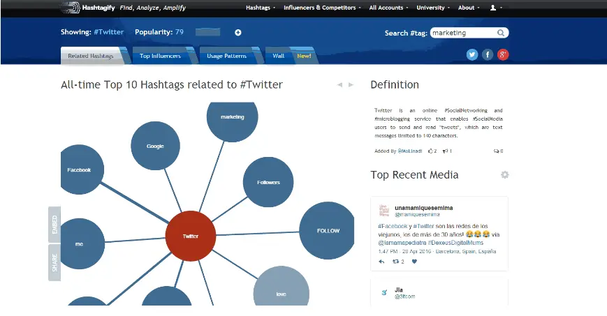 • Hashtagify Suppose you already have your main hashtag. But what about additional ones? Hashtagify will help you link your hashtag to a group of other words. And it also has amazing visualization. It’s a kind of magic! It also shows you in a single glance what you should hashtag.