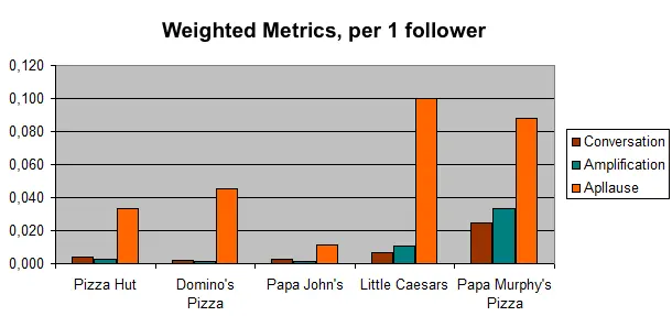 So the final result is 1 : 0.9 : 10.3 ratio between Conversation : Amplification : Applause in Facebook for pizza brands in America. Roughly speaking, this means that the most common proportion is 1 comment : 1 share : 10 likes per post. Of course for more accurate results, more brands would need to be included, but this is a task for another article in the future :)