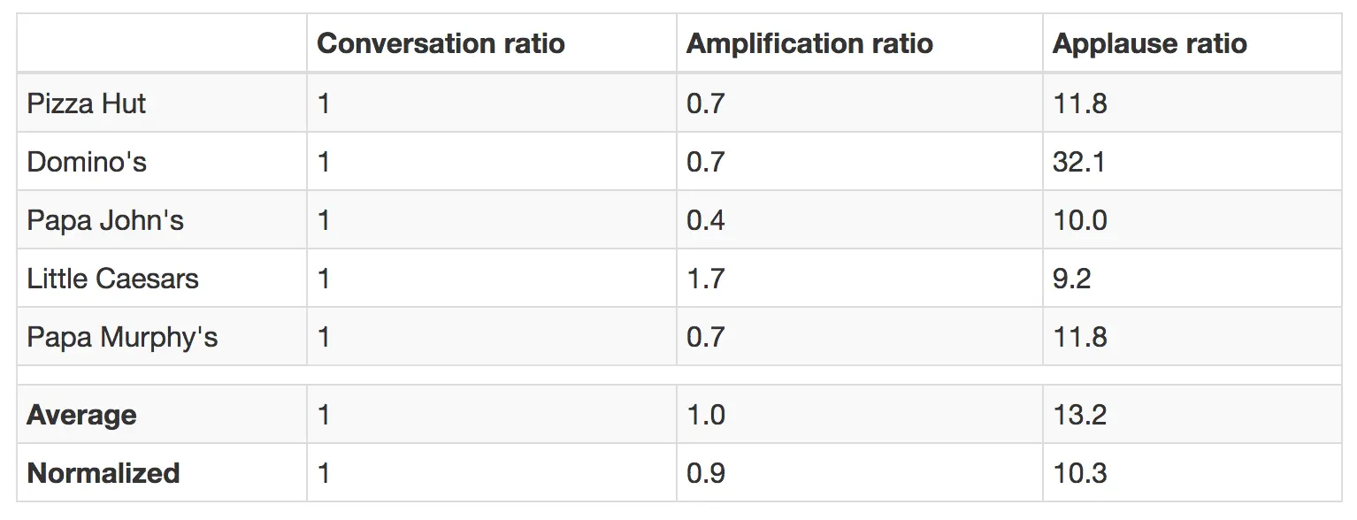 This is how the ratios are calculated, for example, for Pizza Hut: we compared metrics to the Conversation rate so we assigned it a ratio of 1. Then we divided the Amplification rate by the Conversation rate to find out how the first metric differs from the latter, that is (226.05/312) = 0.7. The same is done with the Applause rate: (2670.7/312) = 11.8, which means the Applause rate is 11.8 times higher than Conversation rate.