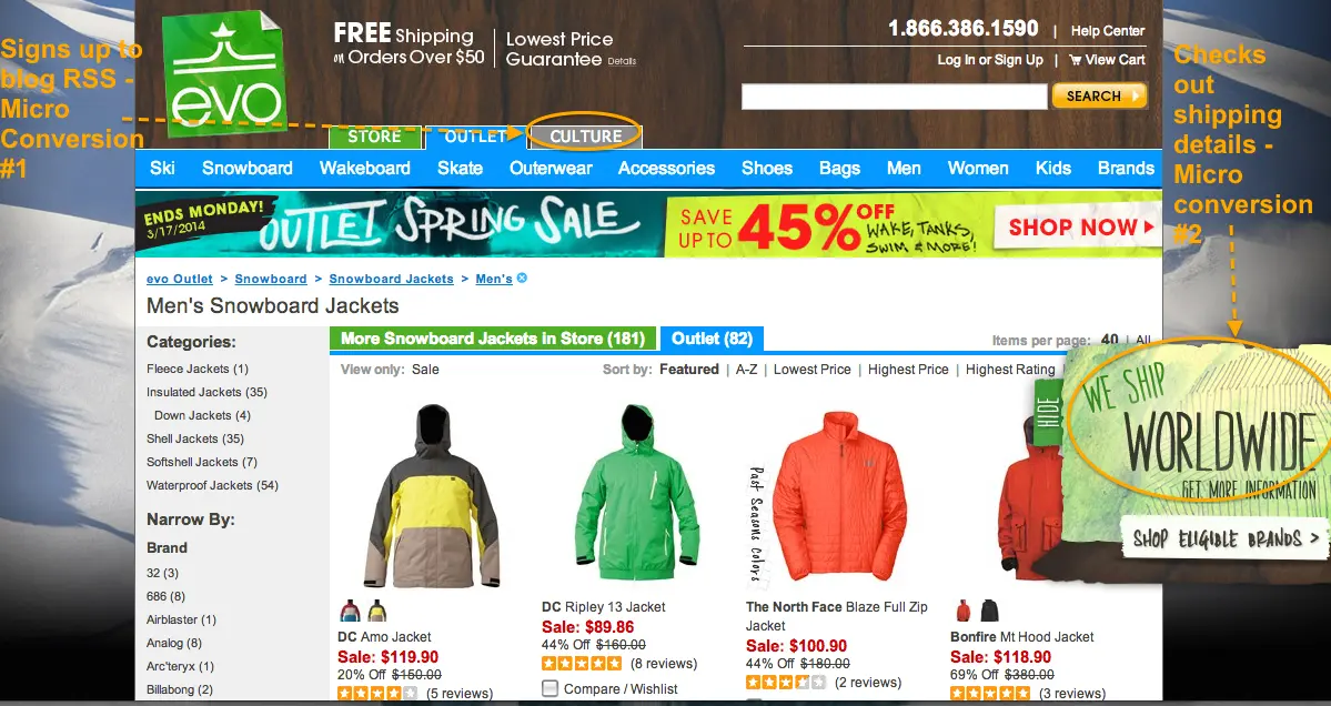 So he adds your blog’s RSS feed to his RSS reader to keep learning more about snowboarding and how to select the best equipment (Micro conversion #1). He also checks out the info about worldwide shipping – since Mr. Green lives outside the US, this is crucial for him (Micro conversion #2).