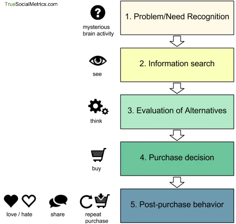 So unless you have some advanced-extraterrestrial-predictive-statistical model calculating how many of your fans, who currently don’t have a need to buy anything, will purchase from you in a future, then you can’t calculate ROI correctly for your SMM strategy! In this case it is designed for the “Need recognition” and “Information Search” stages (stages 1 and 2) so until you acknowledge this and accept it, your boss and clients will always be unhappy.