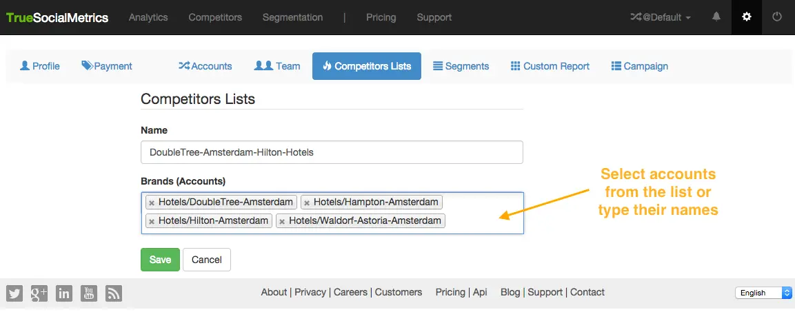 Group accounts with Competitors lists to easily compare different clusters of brands and analyze your account in different contexts.