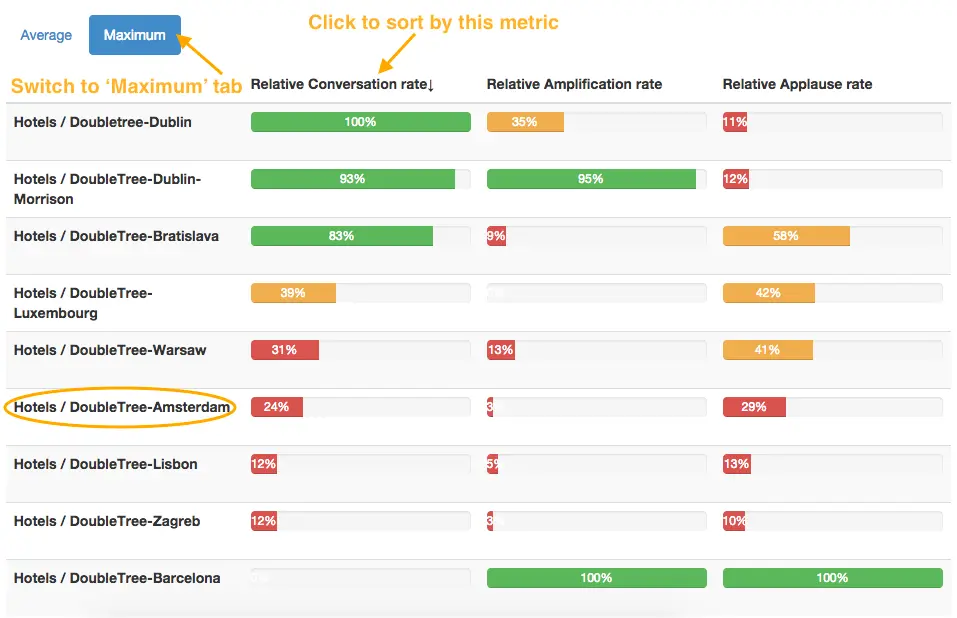 For example, in a screenshot below shows that Coca Cola has reached only 28% of the maximum possible result for Conversation rate on Twitter, based on the results from Coca Cola and 4 of their top competitors’ results (Maximum tab).