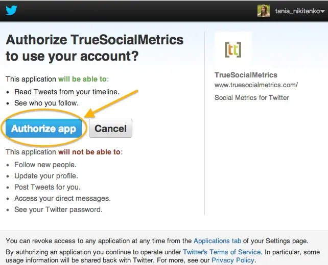 Note: when you connect a competitor's social media account for Twitter, YouTube, or Tumblr, you will be asked to authorize TrueSocialMetrics for read-only access to your account. This is necessary to provide TrueSocialMetrics with access to APIs for these social networks. It will use your own account login credentials, not your competitor's.
