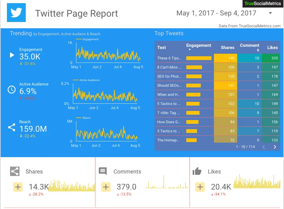 We have replaced our Custom Reports with Google Data Studio integration feature. Google Data Studio will help you create beautiful customized reports with pretty design and data visualizations like this one: