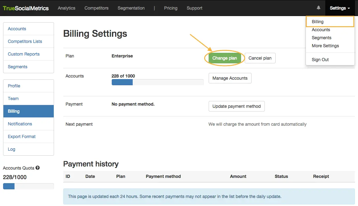 You can Upgrade your plan at Settings -> Billing page by clicking on the 'Change plan' button.