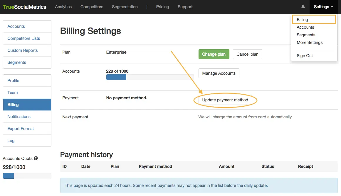 At your Settings -> Billing page by clicking on the 'Update payment method' button. You would need to know your Order Number. -