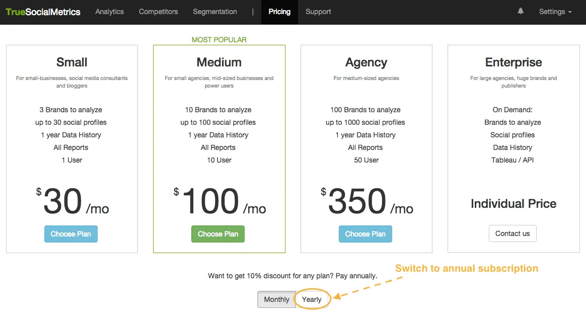 Yes. If you prepay for one year, we will give you a 10% discount, which is a bit more than one month free. Roughly speaking, you'll pay for 11 months up front and get 12 months of access. You can purchase an annual subscription at the Pricing page as displayed on a screenshot below: