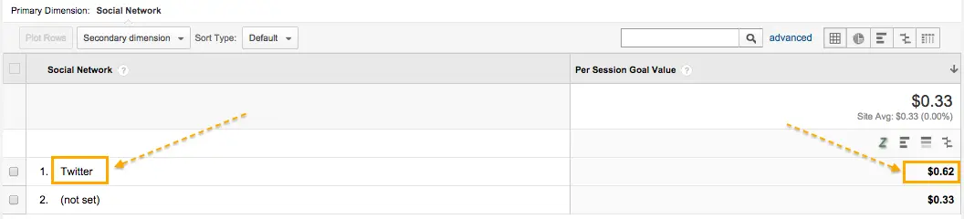 If this report will show $0 for Per Session Goal Value for visits from Social Networks, than it would be the reason Economic value is appearing as "0" in your TrueSocialMetrics reports.