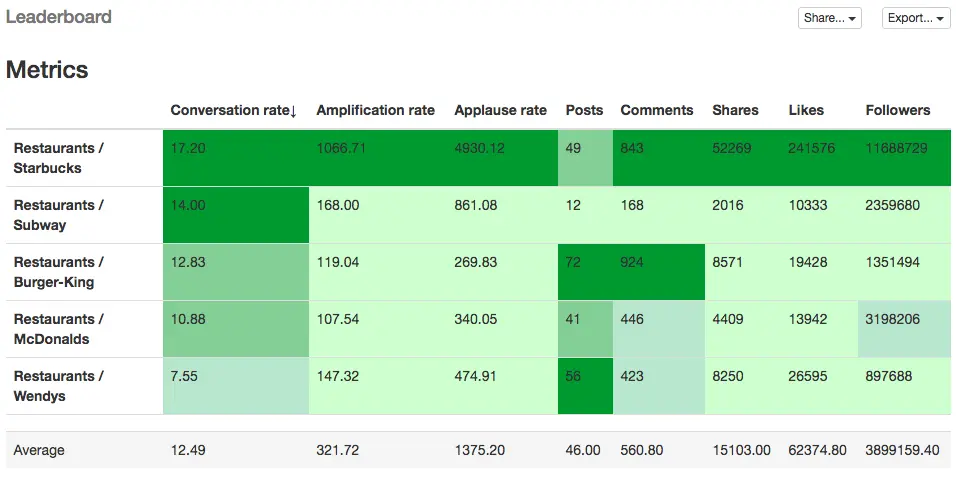 Sort the table and find the leader in your landscape by each social interaction, metric or Number of Followers.