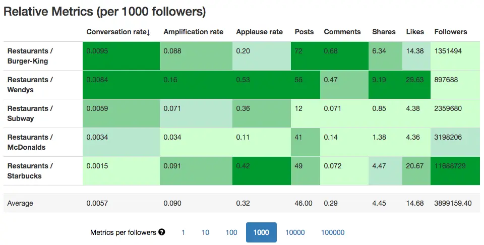 (By default, these metrics are divided by 1000 Followers, but you can select a different scale from the switcher below the table).
