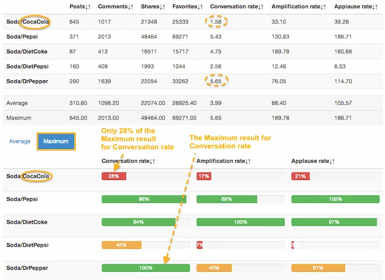 For example, the screenshot below shows that Coca Cola has reached only 23% of the maximum possible result for Conversation rate on Twitter, based on the results from Coca Cola and 4 of their top competitors’ results (Maximum tab).