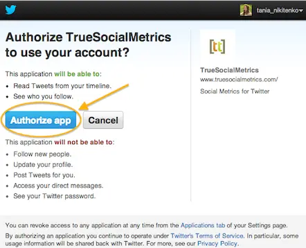 Note: when you connect a social media account for Twitter, YouTube, or Tumblr, you will be asked to authorize TrueSocialMetrics for read-only access to your account (we can't post anything from your Twitter account). This is necessary to provide TrueSocialMetrics with access to APIs for these social networks. It will use your personal account login credentials, not the credentials of the analyzed account.