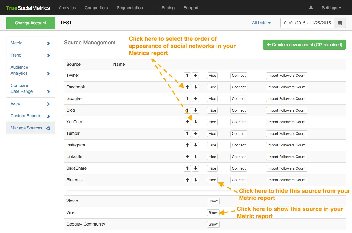You can select which social networks will appear in your reports and in which order. If you are not using some social networks for your business, it would be more convenient to hide them from reports.