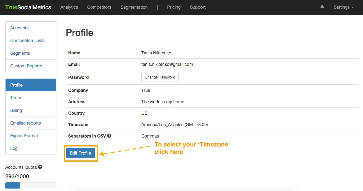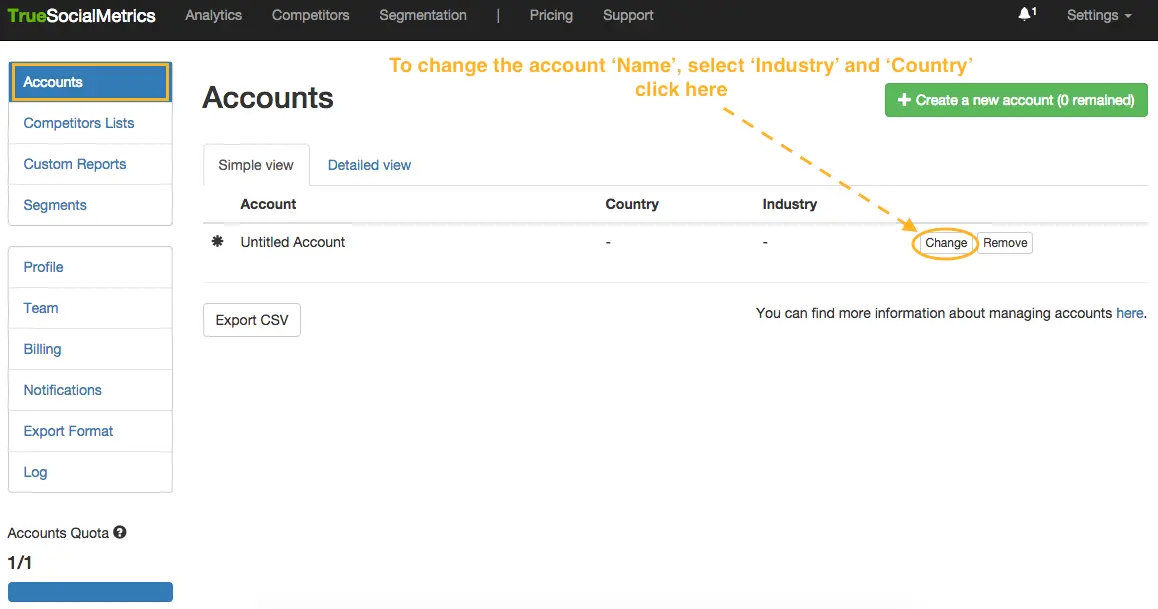 When you register at TrueSocialMetrics you will have your first 'Untitled' account without any settings set up. So you would need to change this account's name to something more recognizable and select the 'Country' and 'Industry' for the account in order to get results for your 'Industry Standard' report.