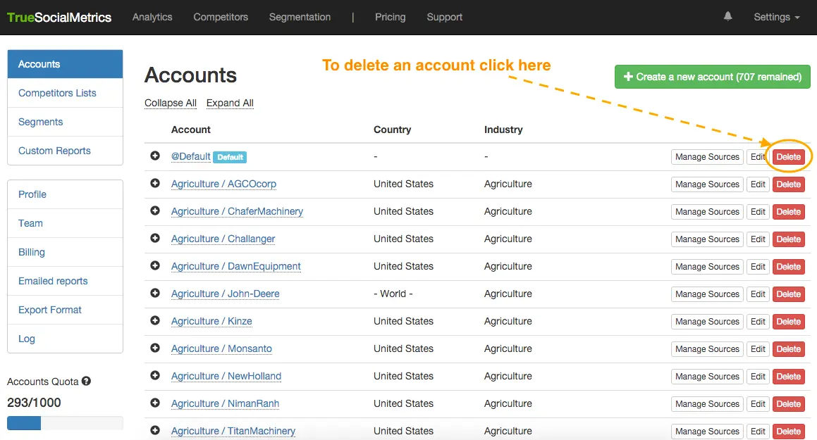 By default, when you register at TrueSocialMetrics you will have access to 1 account (1 set of social media pages). One account gives you access to a set of social media pages from 10 sources, with 1 page per social media source. This means that you can track 1 Twitter profile, 1 Facebook page, 1 Google+ page, 1 YouTube channel/page, 1 Blog, 1 LinkedIn company page, 1 Instagram profile, 1 Tumblr profile, 1 SlideShare profile, and 1 Vimeo account.