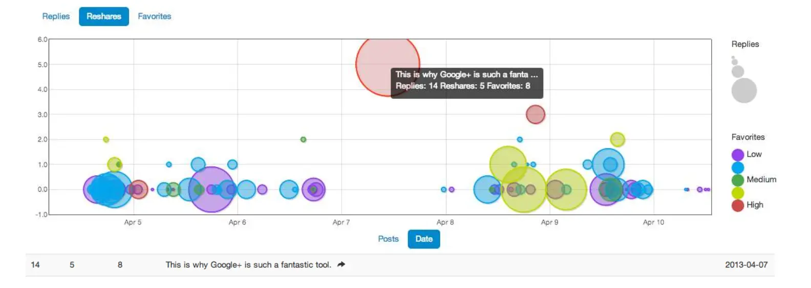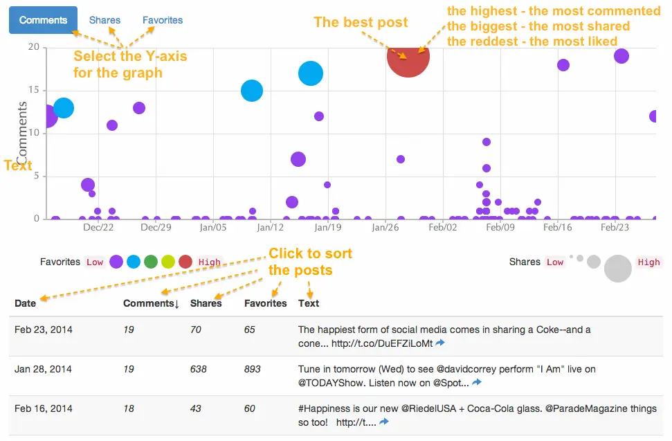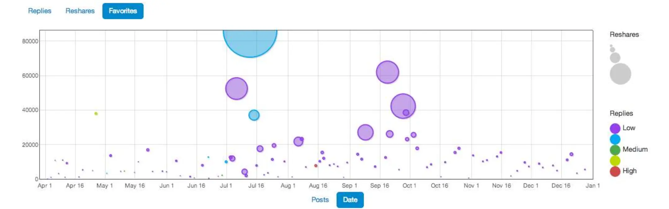 To analyze the graph, use the ‘Sun rule’: the best posts are red, big and high.