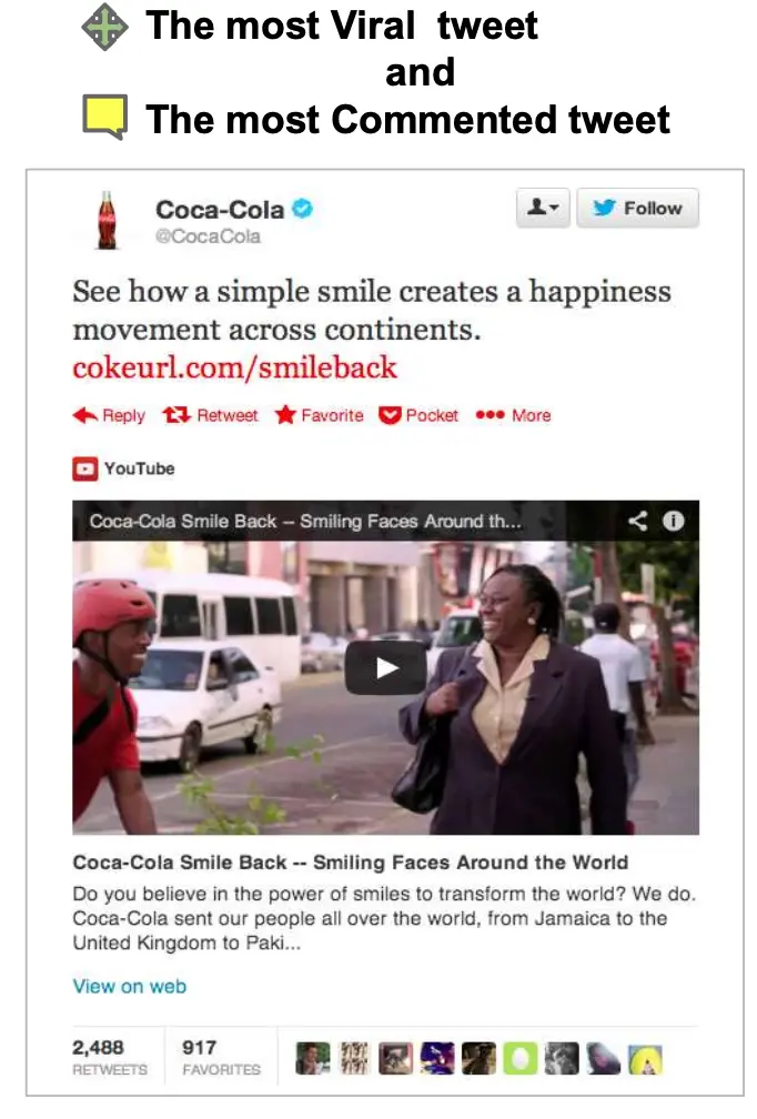 In this example, among top Soda Brands the best tweets In absolute numbers belong to Coca-Cola and Pepsi. The most Favorited Pepsi-tweet features a contest with a chance to win tickets to Beyonce’s show in NYC. The most Viral and Commented tweet nomination is monopolized by Coke, presenting a positive viral video about the power of a smile.