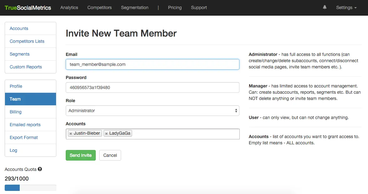 Invite a team member by email at Settings -> Team page. In the form, you will need to specify an email address for you collaborator, assign them a password, their team role, and then select accounts they will have access to.